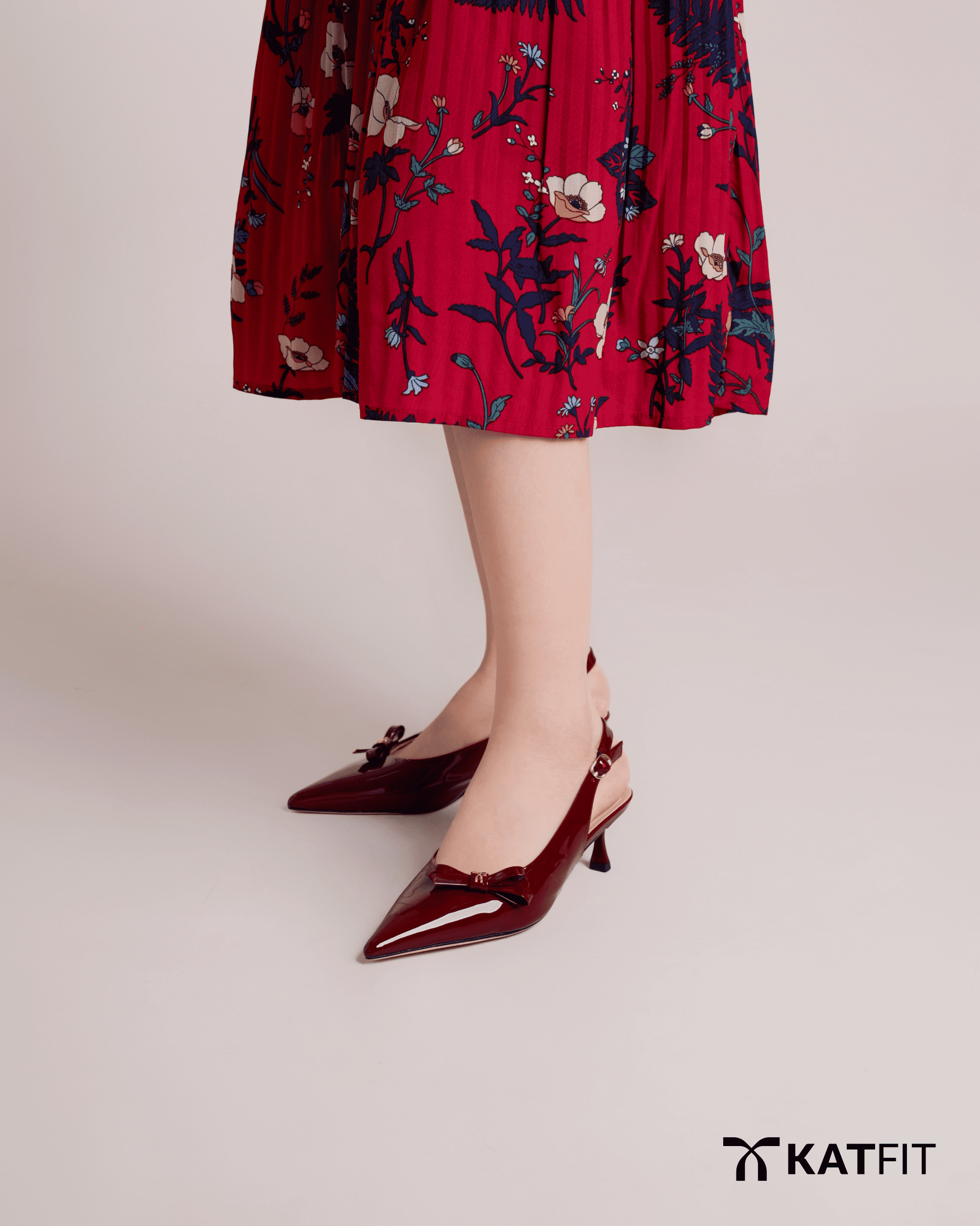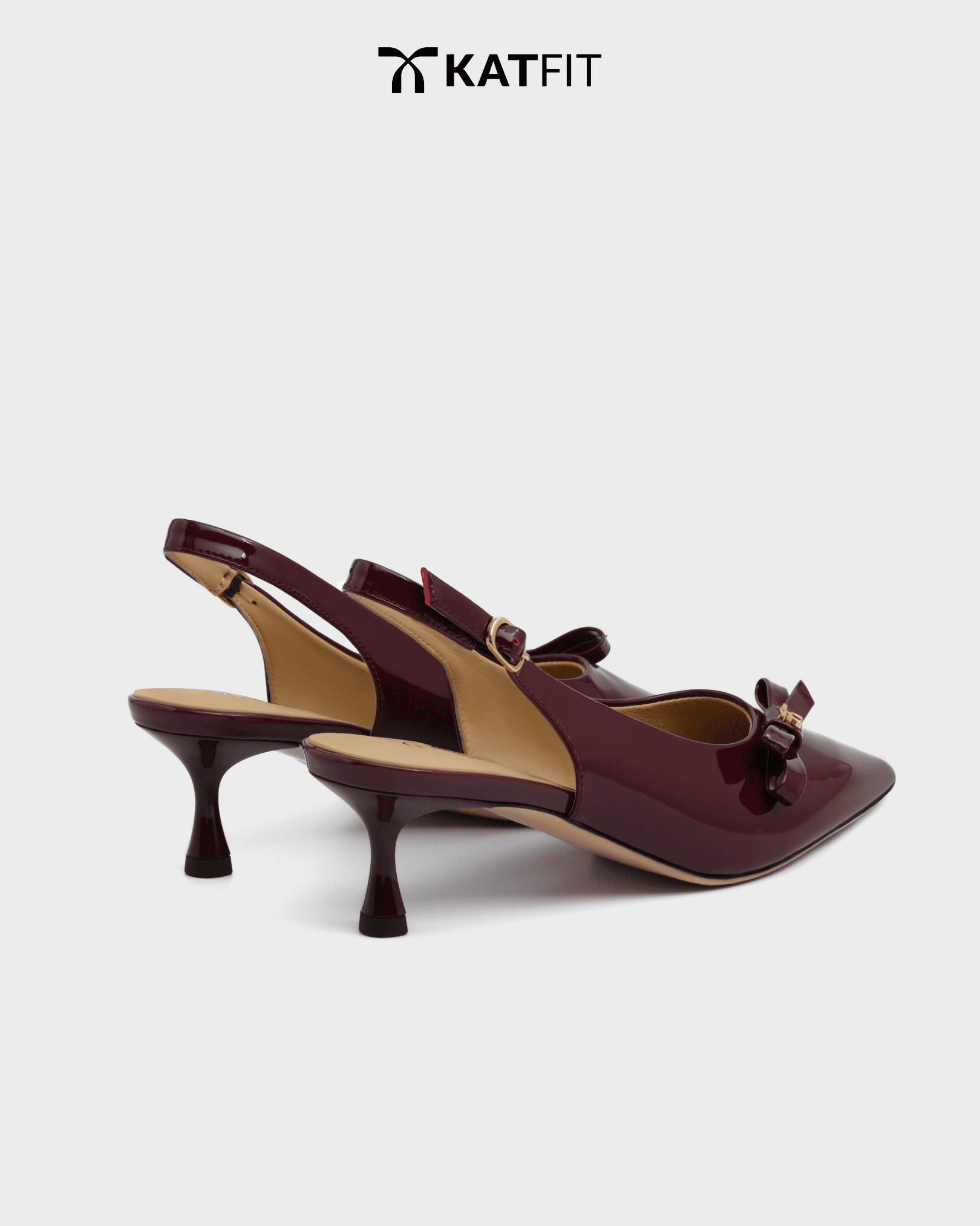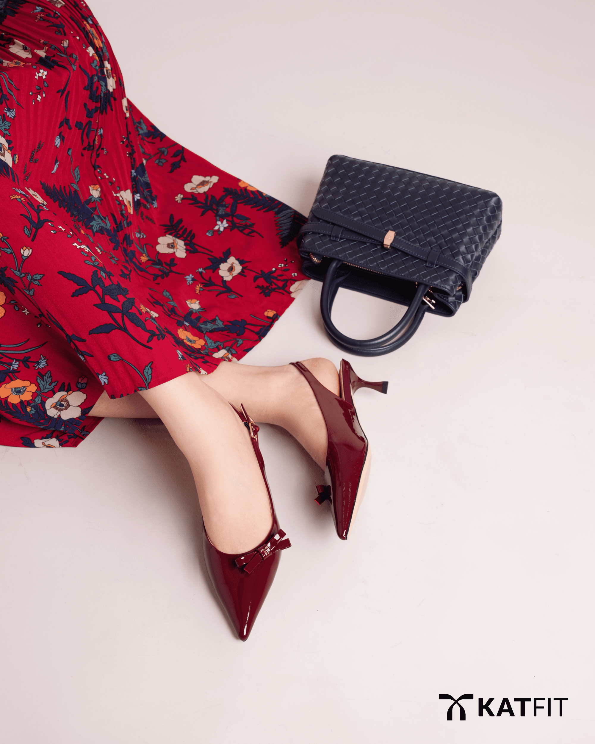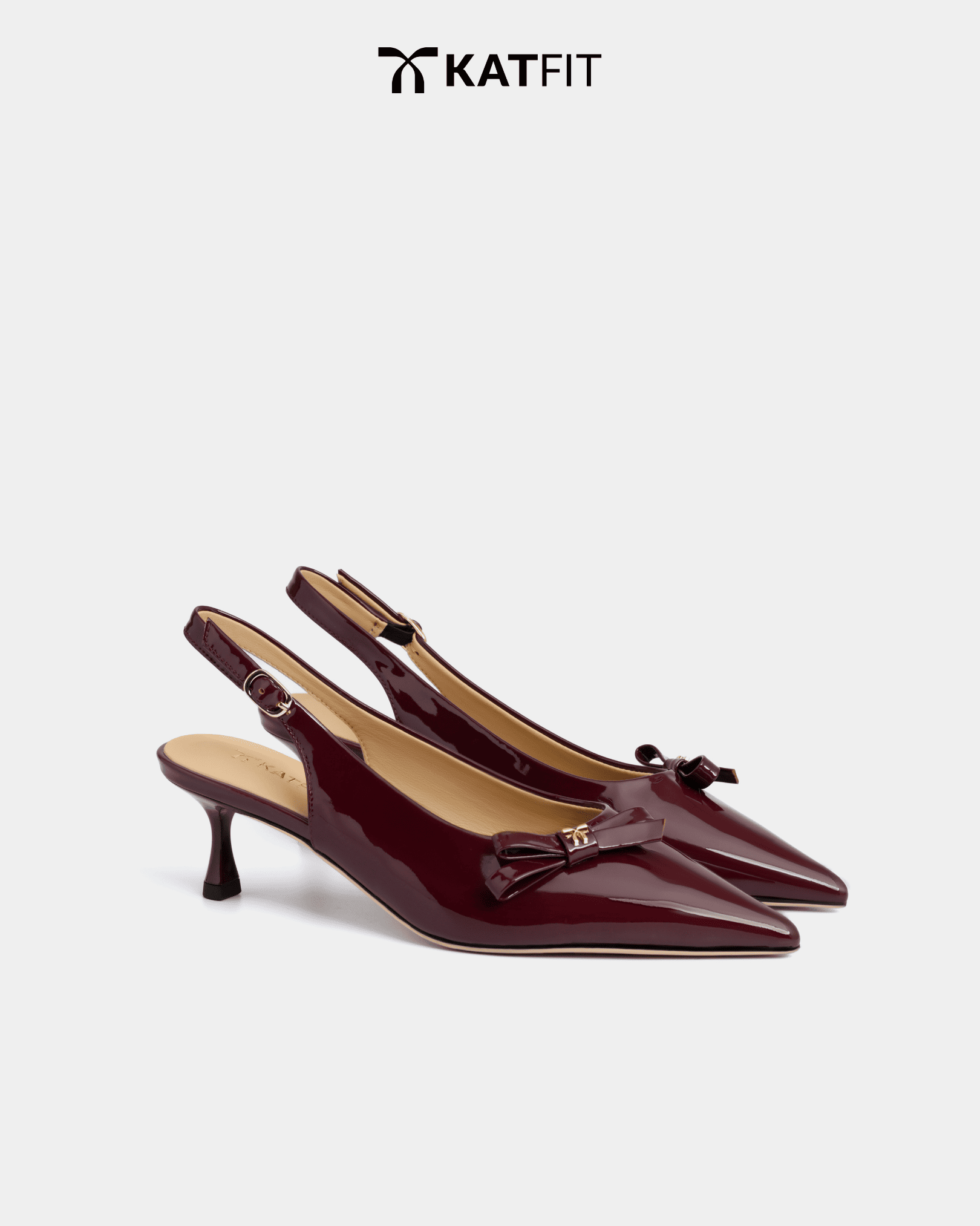 • Khoá/chi tiết: Quai slingback + khóa điều chỉnh + nơ patent kèm charm kim loại KAT