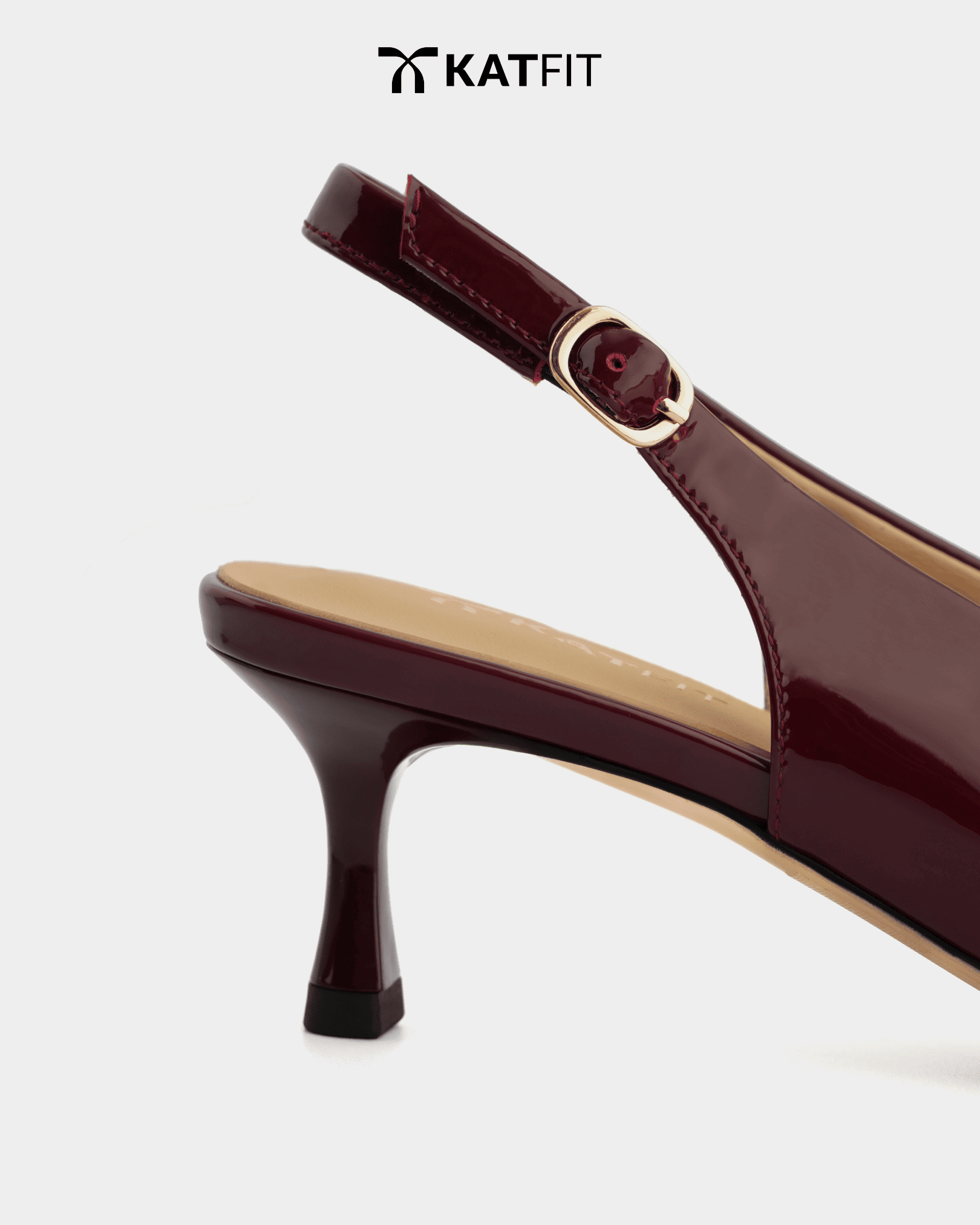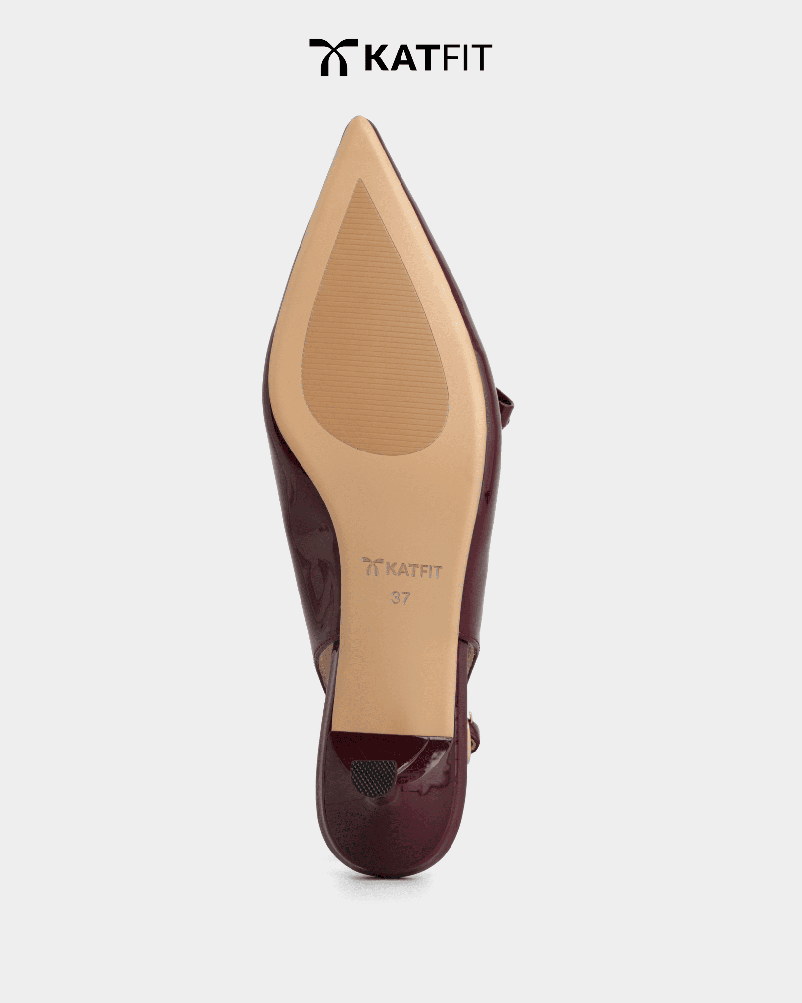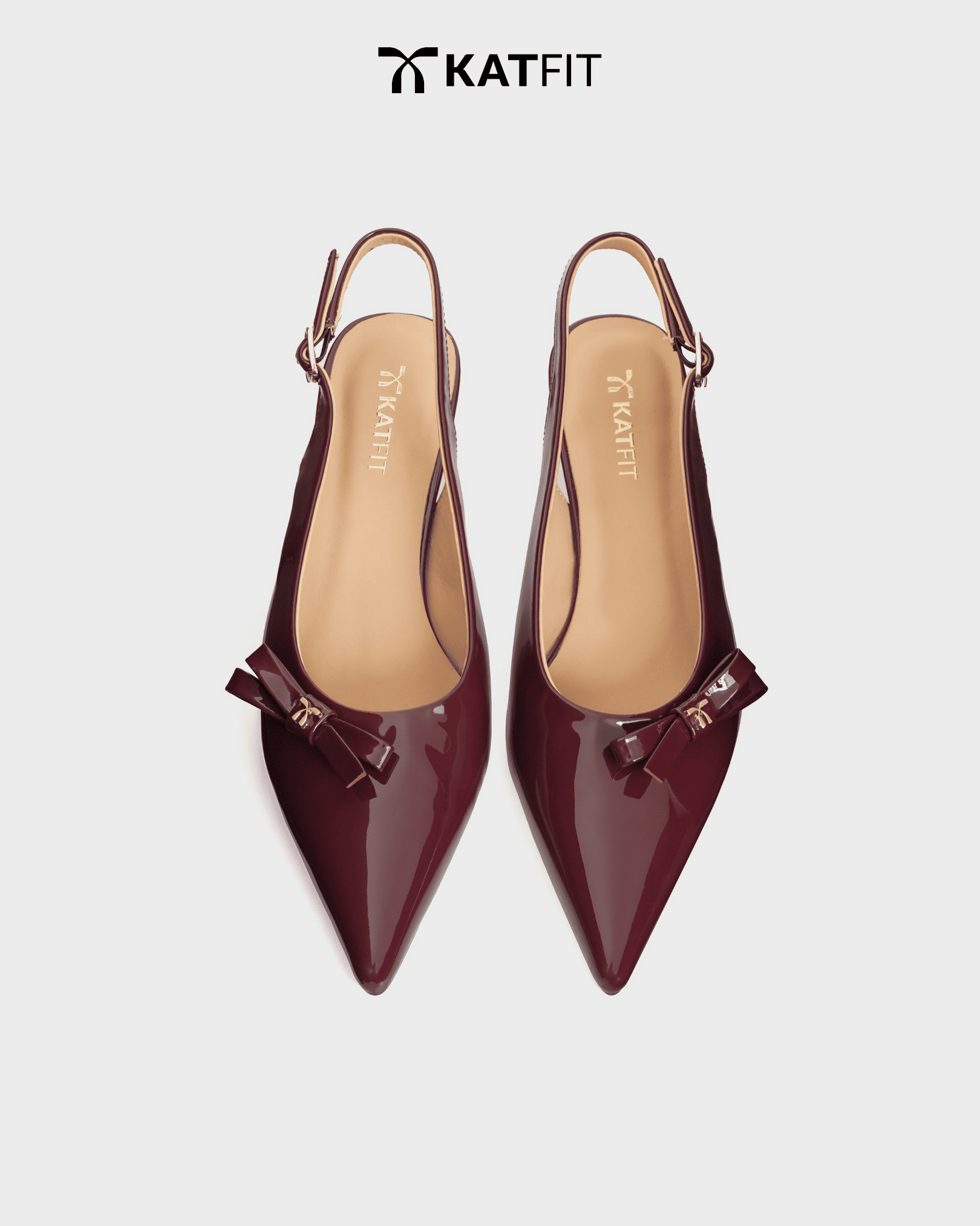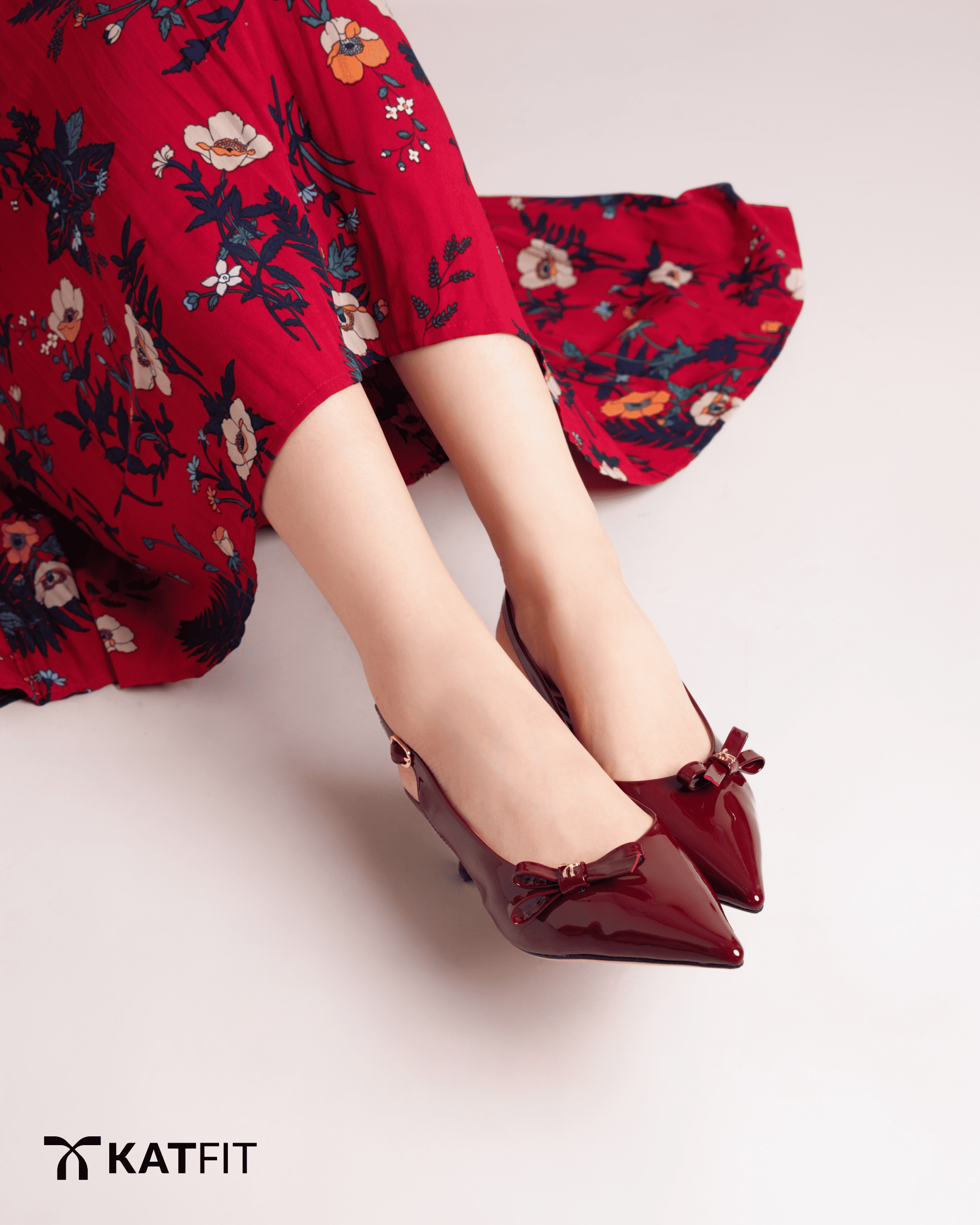 • Khoá/chi tiết: Quai slingback + khóa điều chỉnh + nơ patent kèm charm kim loại KAT