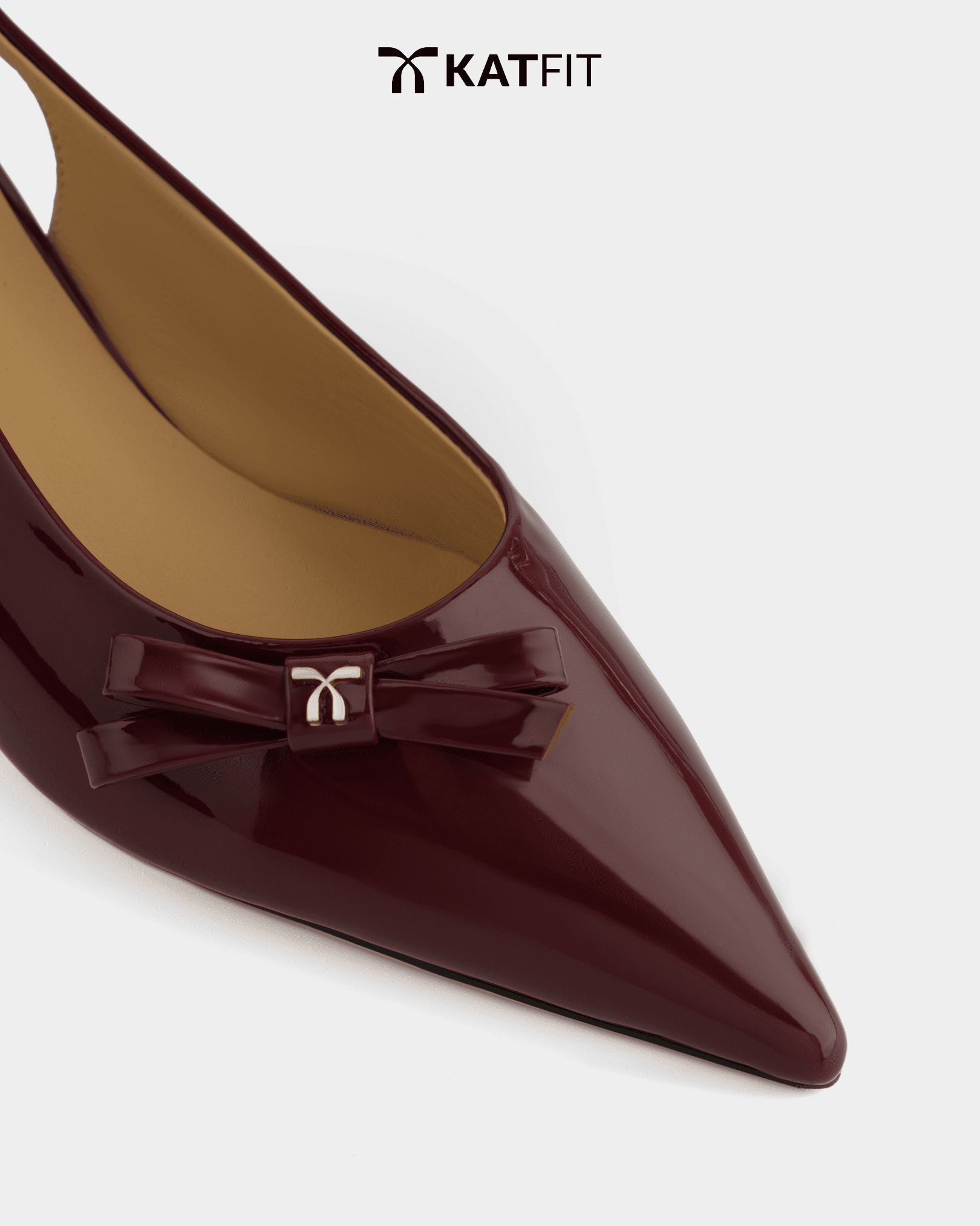 Phom giày mũi nhọn thanh mảnh giúp kéo dài đường chân một cách tự nhiên, tạo hiệu ứng thon gọn và tinh tế. Trên nền form đó, chi tiết nơ chéo tạo điểm nhấn mềm mại, duyên dáng.