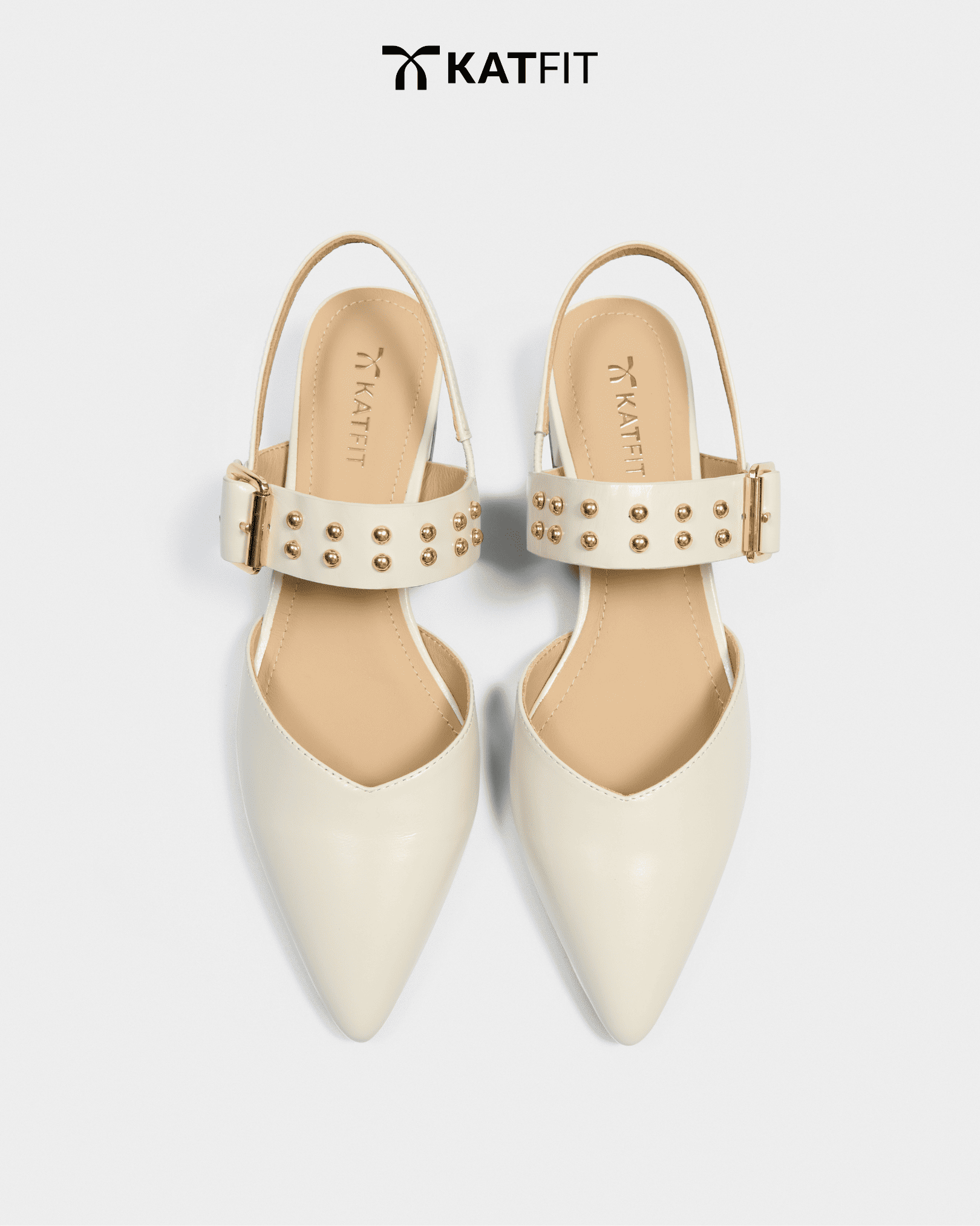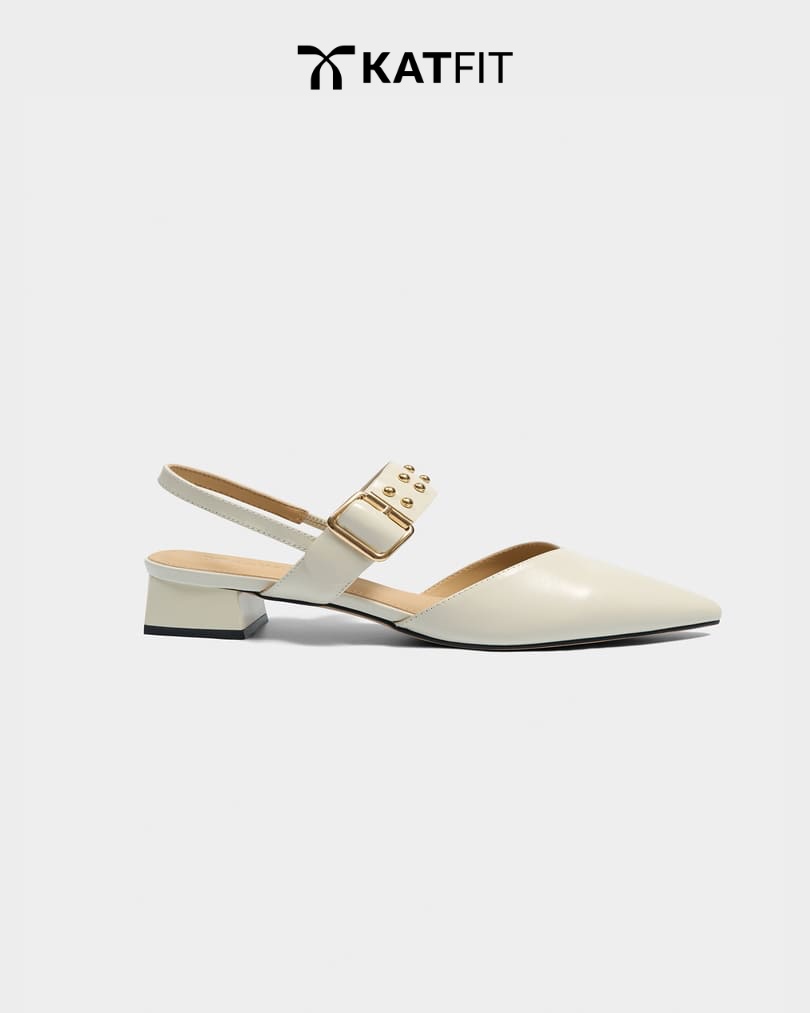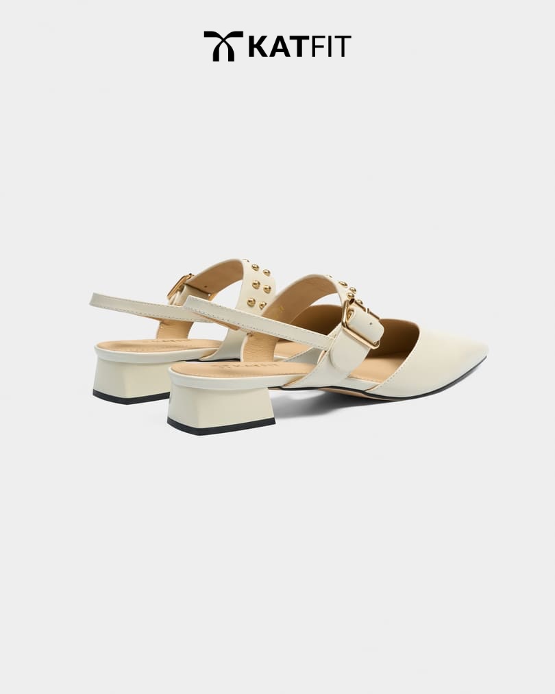 Giày Slingback hở gót màu trắng Iris da thật của KATFIT với mũi nhọn, quai bản to và đinh tán ánh kim nổi bật. Thiết kế giúp bạn luôn tỏa sáng trong mọi hoàn cảnh.